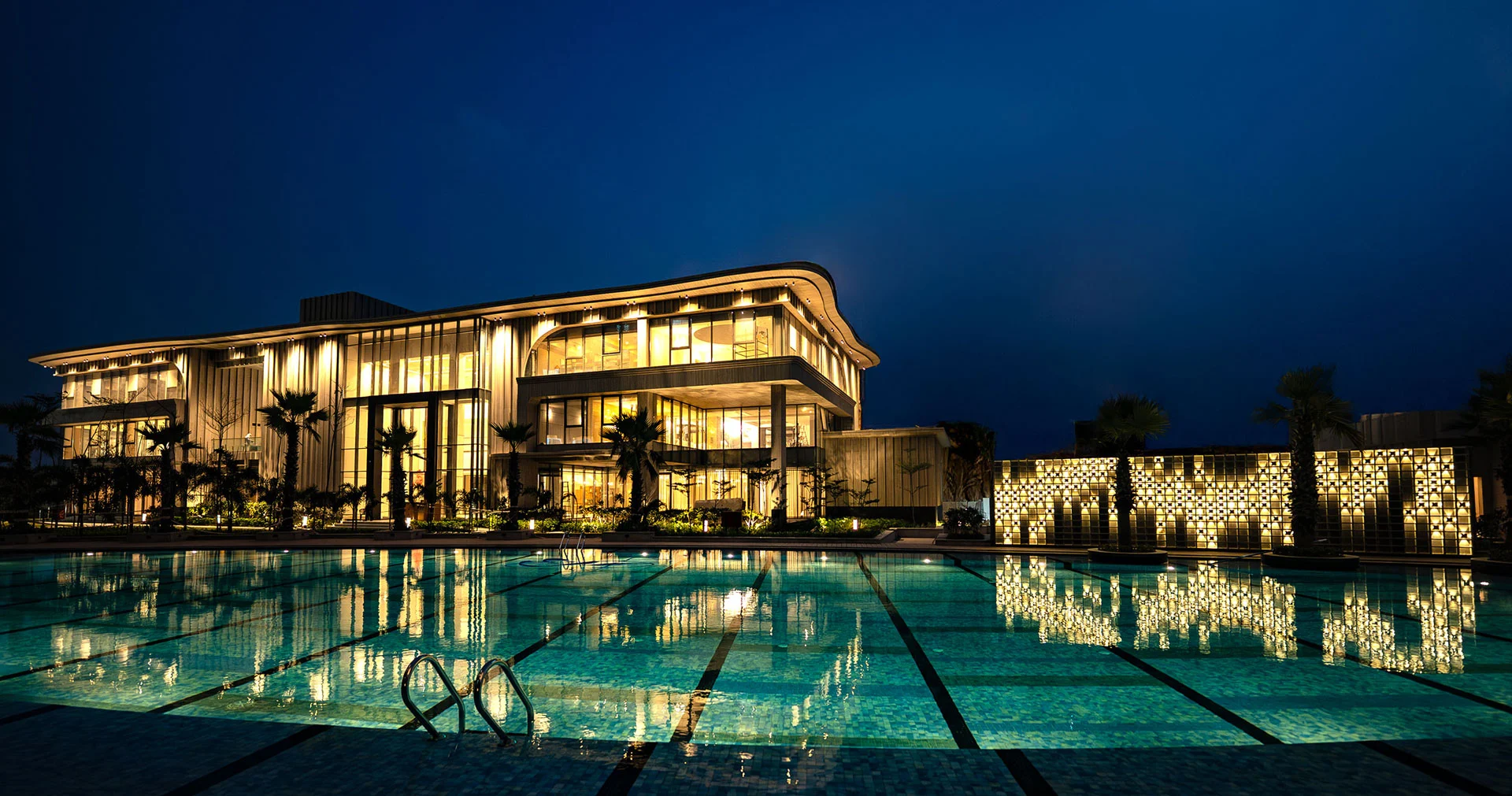 A beautiful resort-style outdoor pool with a unique curved shape and elegant wooden deck.