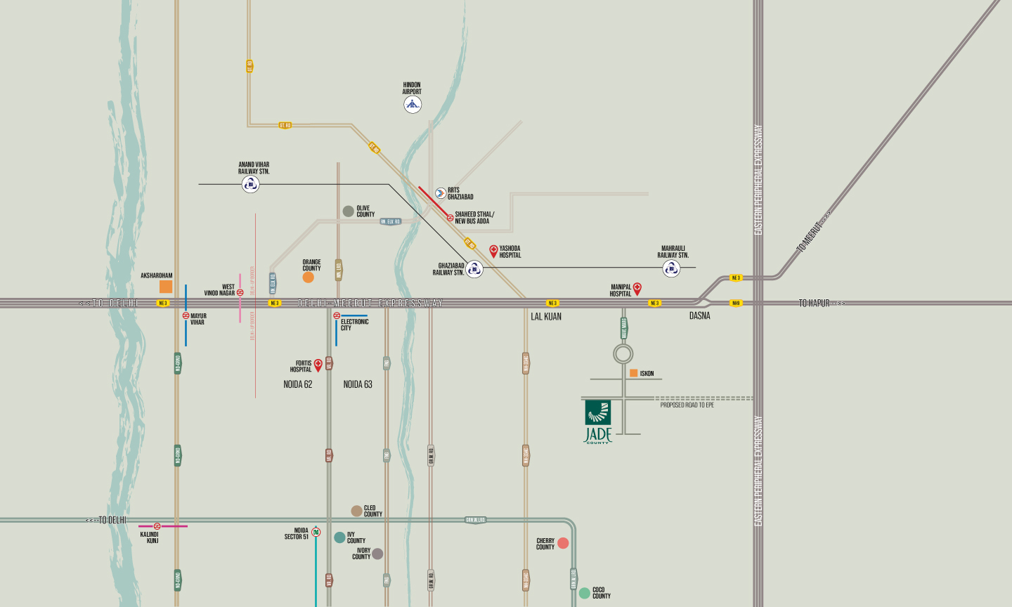 Discover Jade County, a high-rise residential masterpiece located at a bustling thoroughfare across the Delhi Meerut Expressway, it boasts excellent connectivity to Delhi and NCR. This IGBC GOLD rated project champions sustainable urban living through its green design, prioritizing energy efficiency and well-being. Inspired by the enduring allure of the Jade Stone, Jade County seamlessly blends indoor and outdoor spaces. A vast central landscape with a serene waterbody and clubhouse fosters tranquil views, while double-height stilts and grand entrance lobbies create an expansive, connected environment, redefining urban living, making uncompromised luxury accessible.